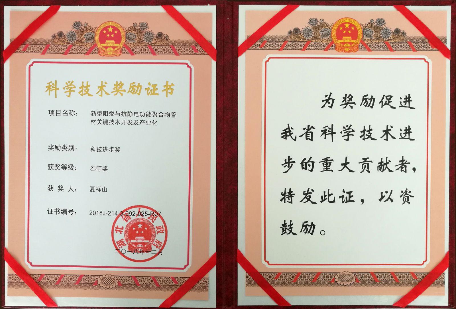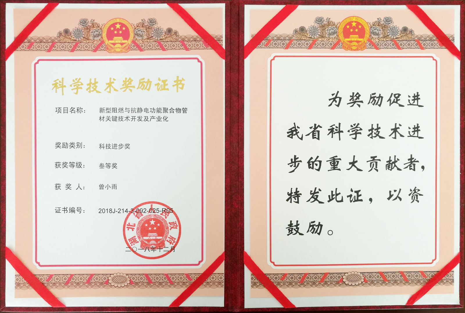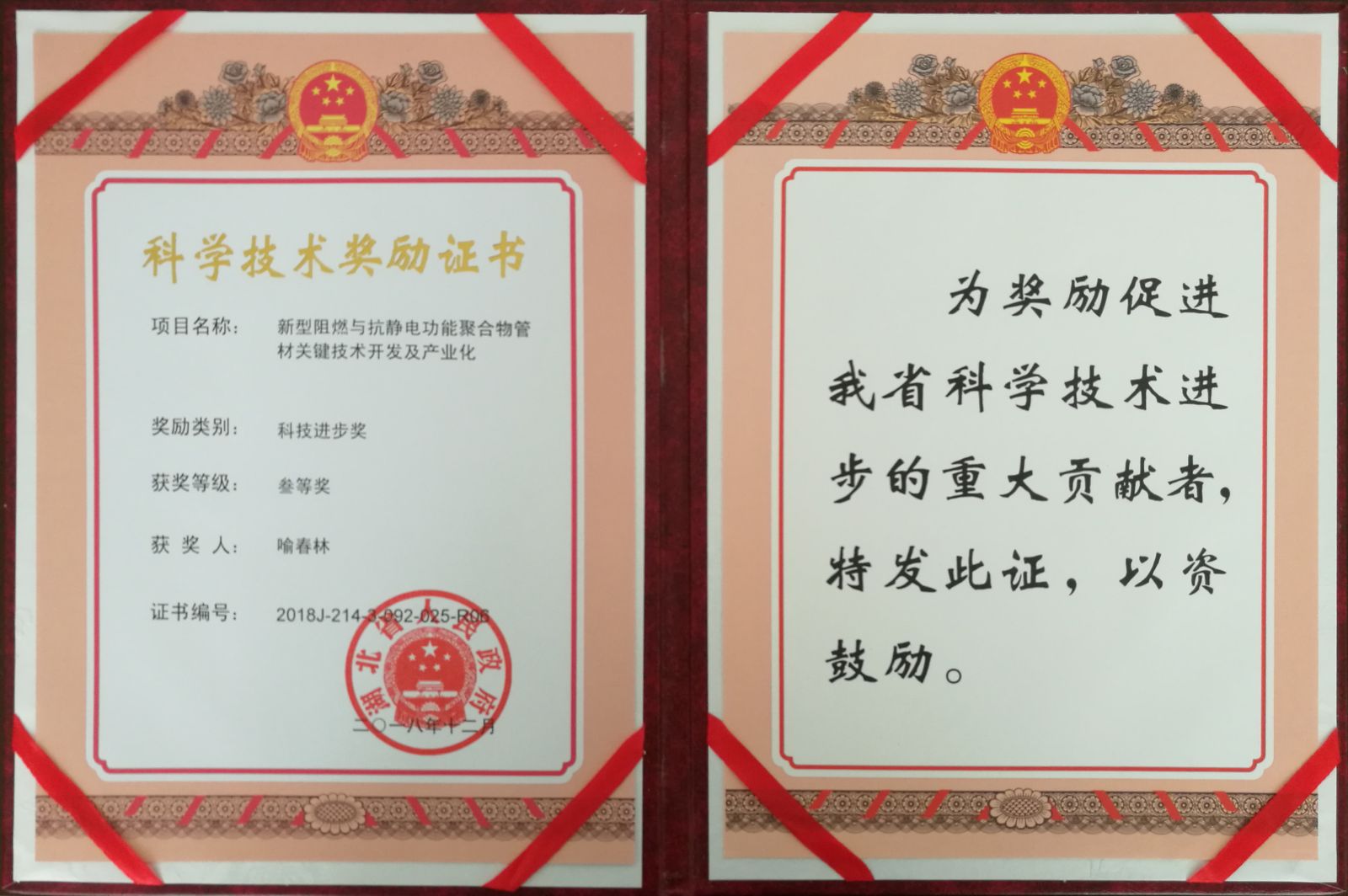 我司新型阻燃與抗靜電功能聚合物管材關(guān)鍵技術(shù)開發(fā)及產(chǎn)業(yè)化項目榮獲湖北省科技進(jìn)步叁等獎。