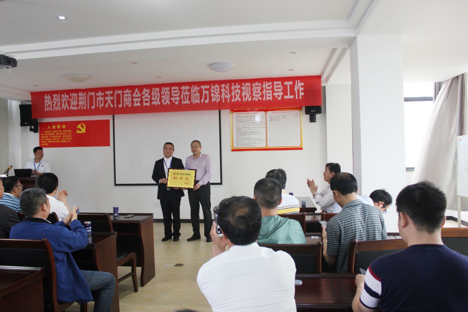 荊門市天商聯(lián)合會會長馬懷義向萬錦科技董事長夏祥義同志頒發(fā)了荊門市天商聯(lián)合會副會長牌匾。