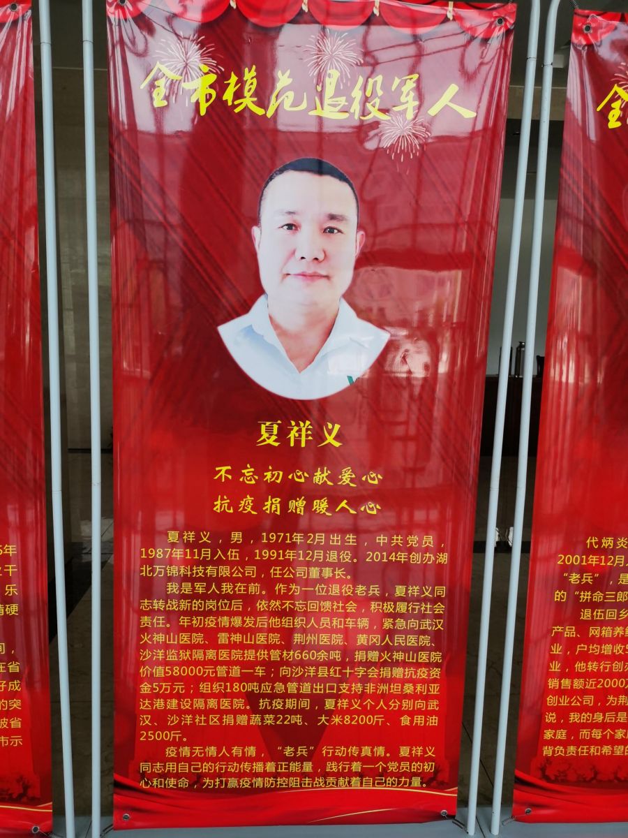 抗疫捐贈暖人心,不忘初心獻(xiàn)愛心——湖北萬錦科技有限公司董事長夏祥義獲得荊門市模范退役軍人榮譽(yù)稱號,作為模范軍人代表作了《使命,在責(zé)任與擔(dān)當(dāng)中升華》的發(fā)言。