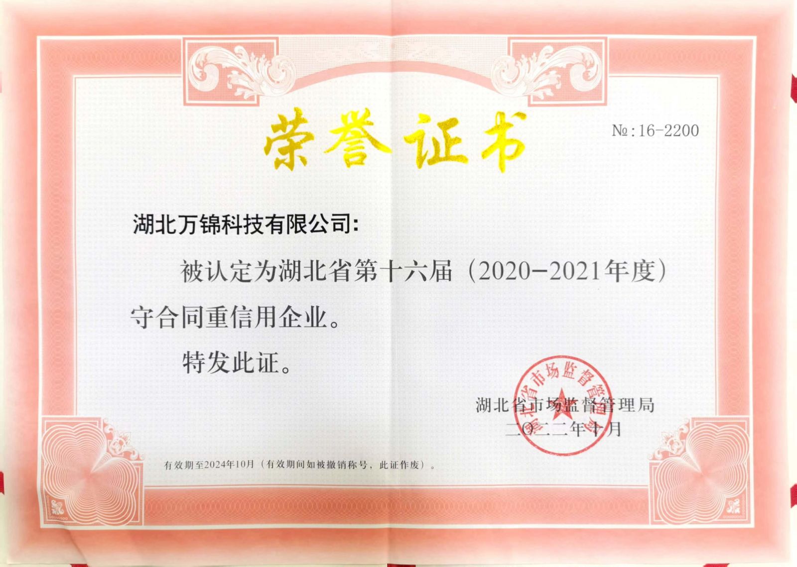11月25日,湖北萬錦科技有限公司憑借良好的經(jīng)營作風(fēng)、優(yōu)質(zhì)的服務(wù)水平和規(guī)范的經(jīng)營管理,獲得了湖北省第十六屆(2020-2021年度)“守合同重信用企業(yè)”榮譽(yù)。